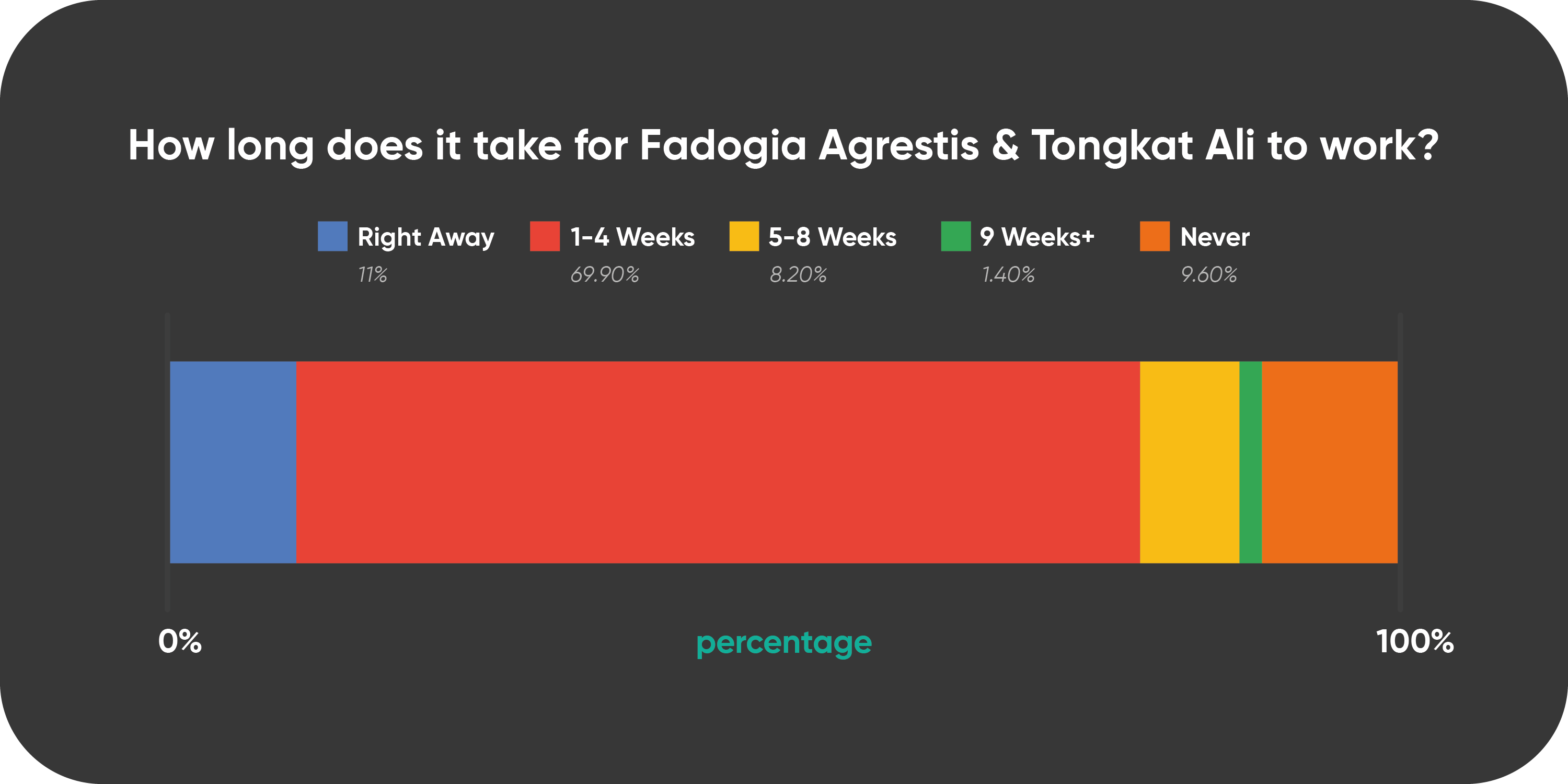 It must be highlighted that 9.6% of users reported never feeling the benefits from the Fadogia Agrestis and Tongkat Ali stack, suggesting that it may not work for some individuals or there may be lifestyle factors inhibiting the ability of these compounds.