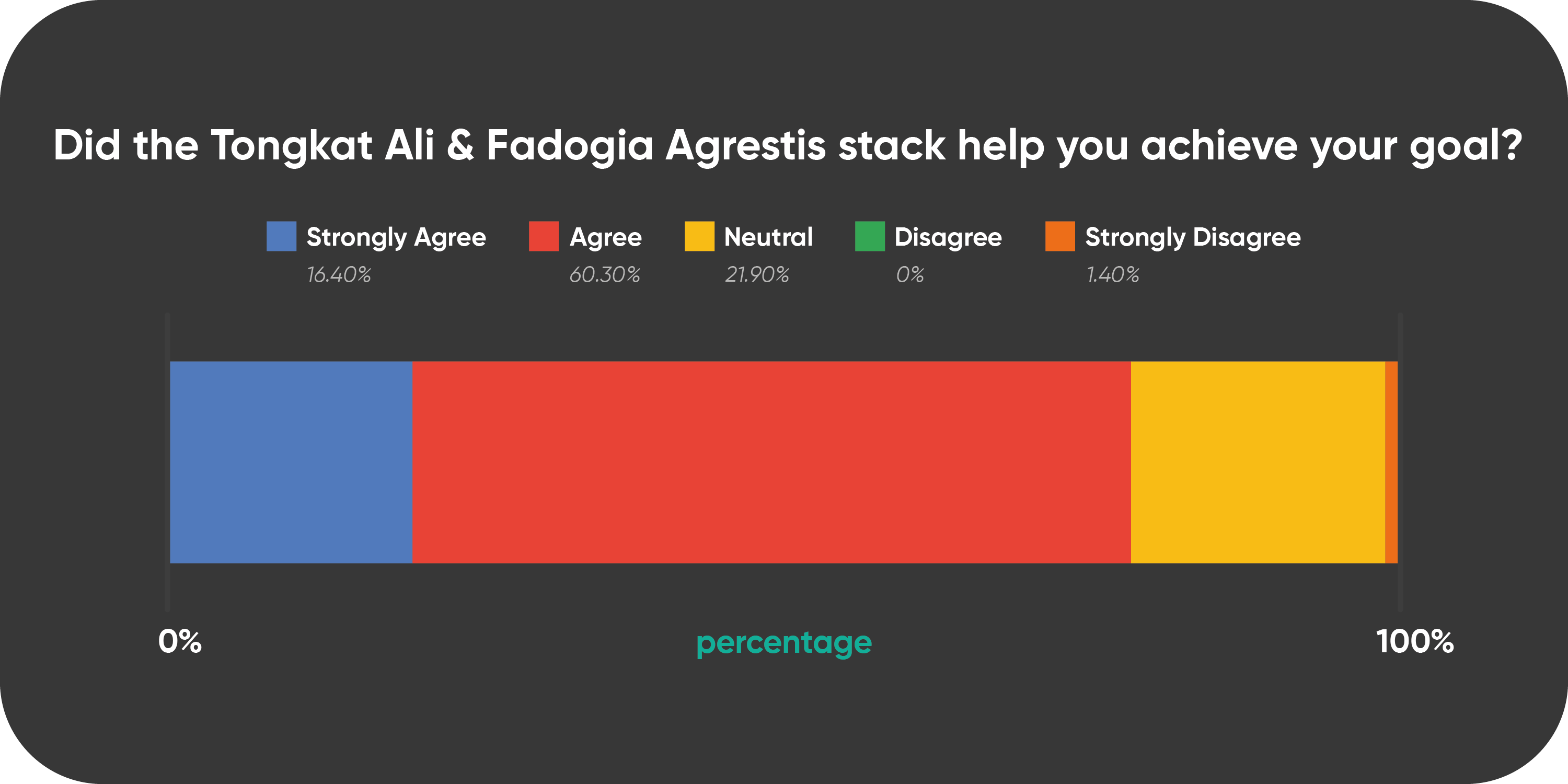 76.7% agreed or strongly agreed that Fadogia Agrestis and Tongkat Ali helped them achieve their goal. Only 1 person disagreed. These statistics are dependent on what they used the stack for, but as the results show, most users take it for muscle development, testosterone boost, athletic performance and libido. Therefore, with over ¾ of users feeling satisfied that it worked as intended, it will likely be effective for you.