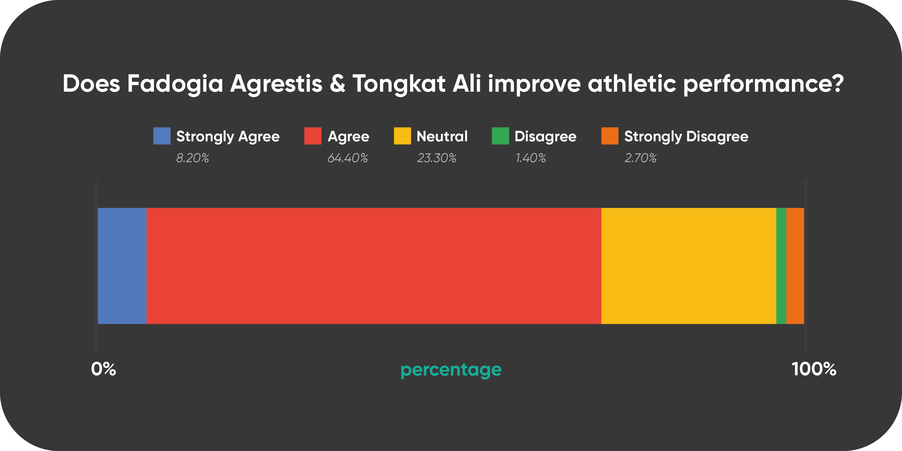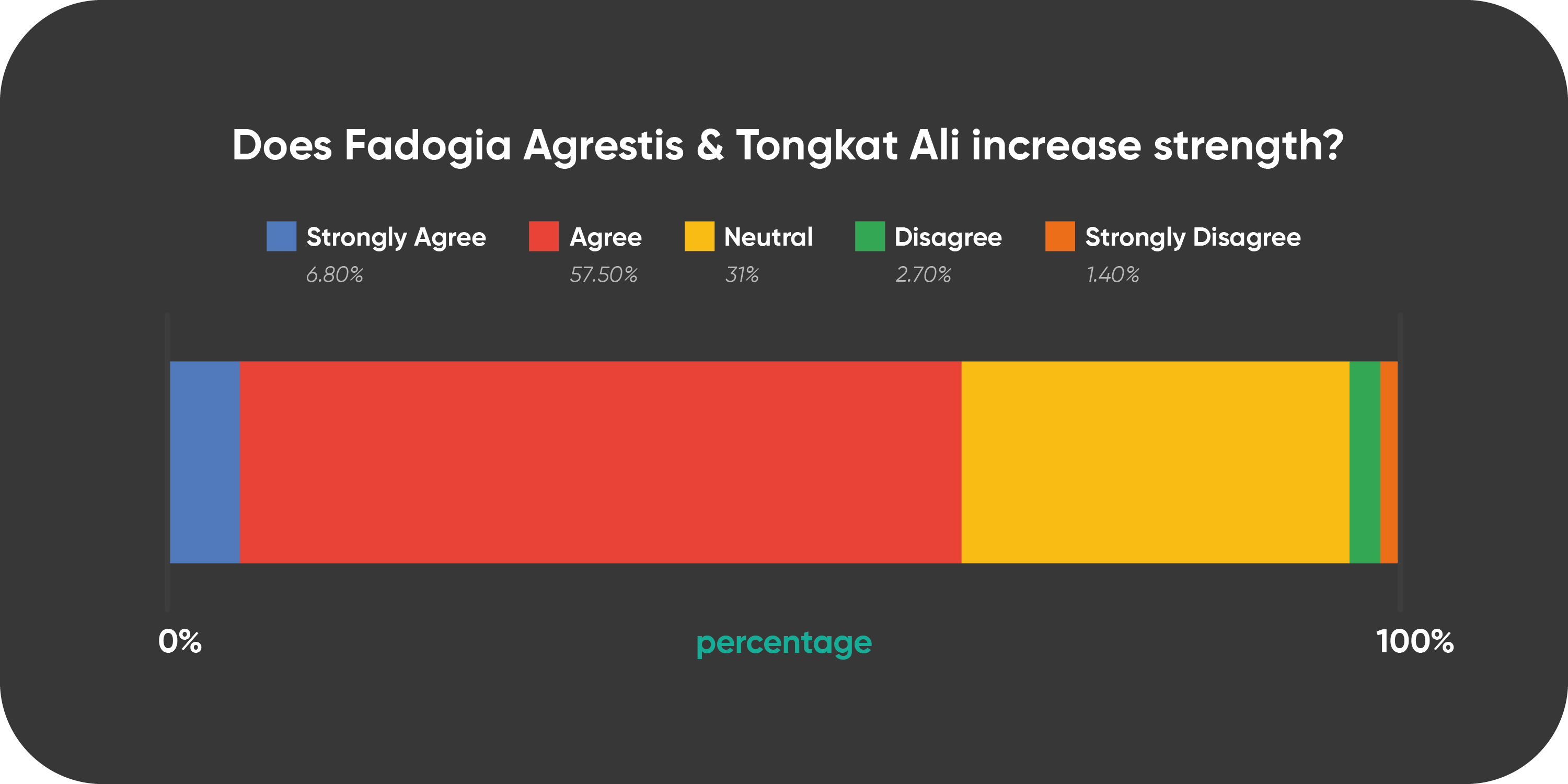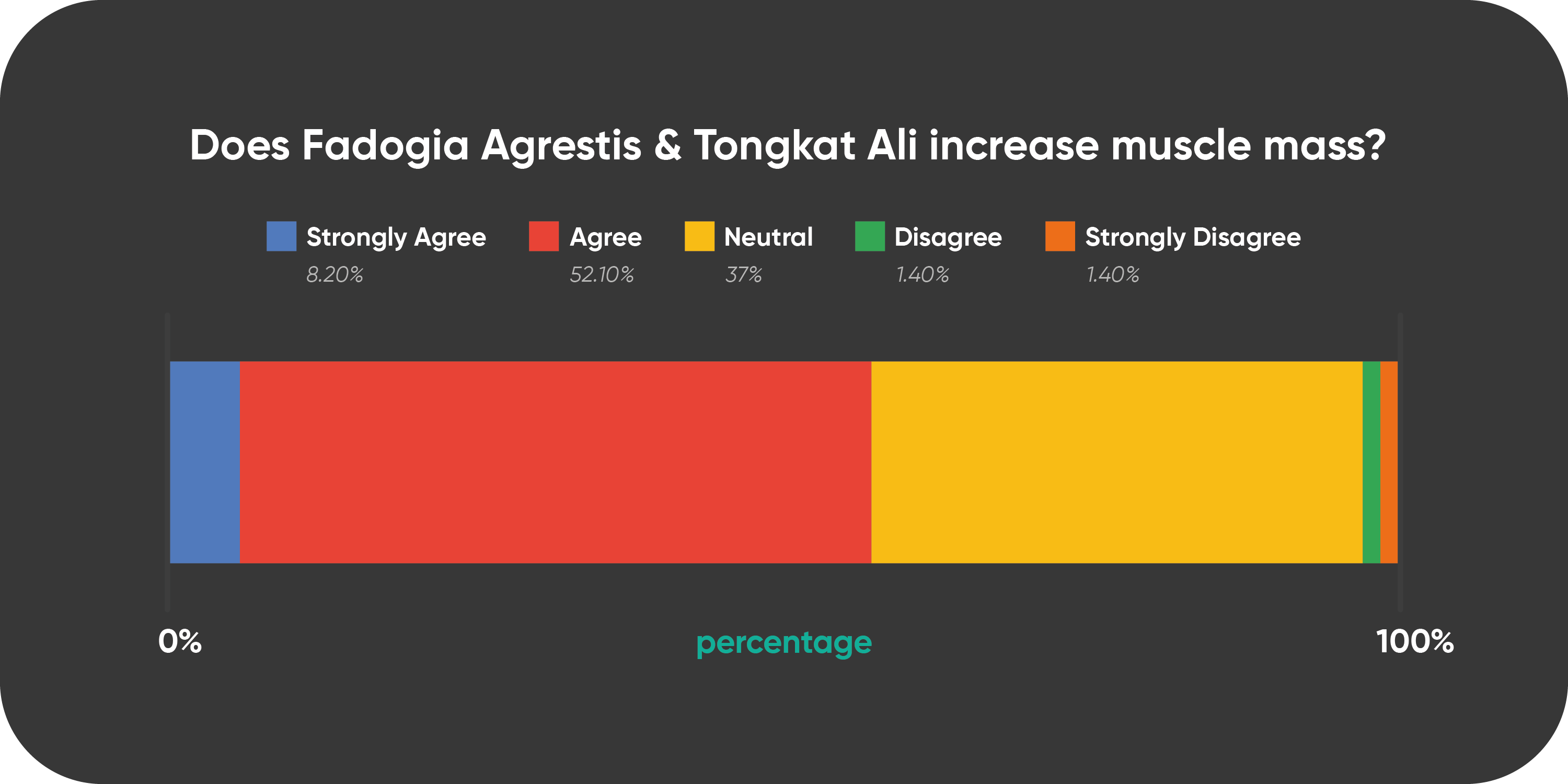 60.3% of users reported that they agreed or strongly agreed that Fadogia Agrestis and Tongkat Ali helped them increase their muscle mass. Only 2 people disagreed or strongly disagreed. This data strongly favours that Fadogia Agrestis and Tongkat Ali can boost muscle growth. This effect is fascinating as it is a natural supplement stack, and therefore has no steroidal side effects.