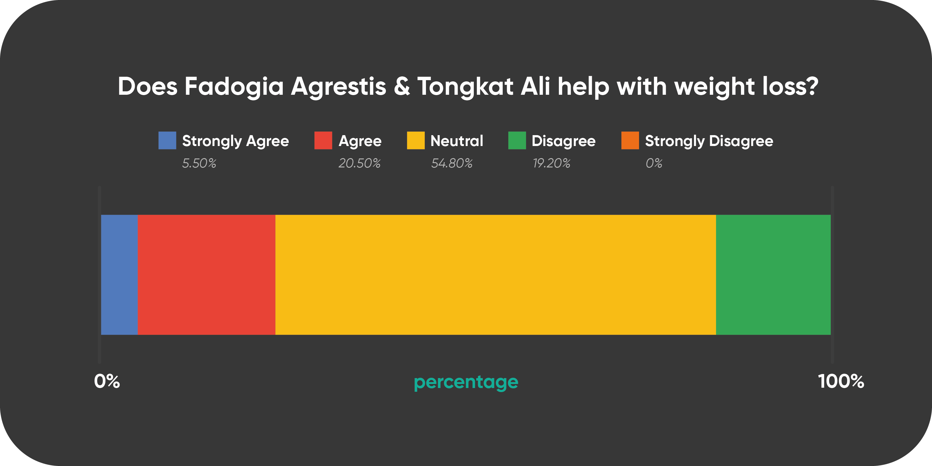 Only 10 of the respondents used this stack for this purpose, however, we wanted to know if weight loss is generally experienced when using the compounds together. 26% of users reported that they agreed or strongly agreed that Fadogia Agrestis and Tongkat Ali helped them lose weight.