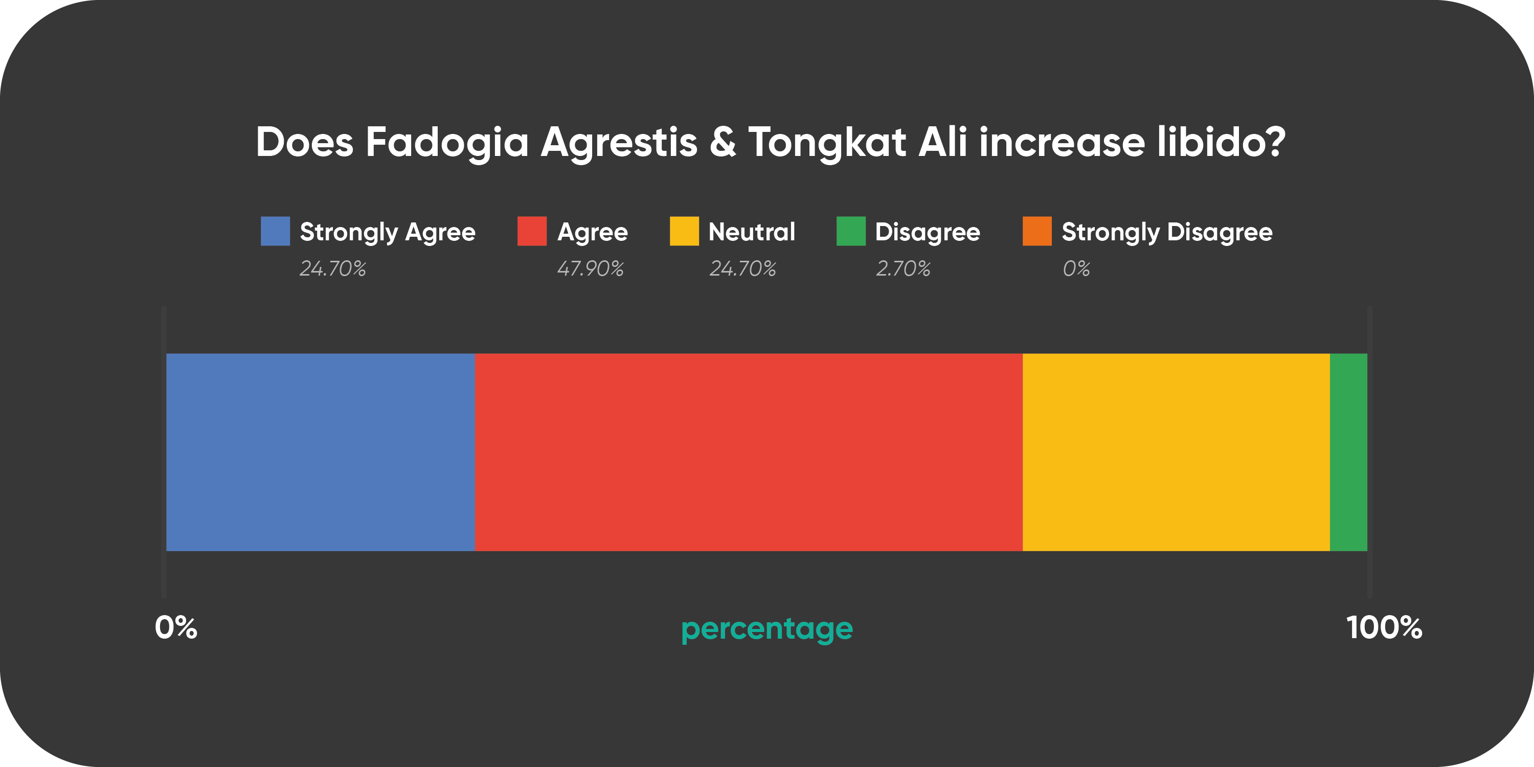 72.6% of users reported that they agreed or strongly agreed that Fadogia Agrestis and Tongkat Ali increase their libido. Only 2 people disagreed.