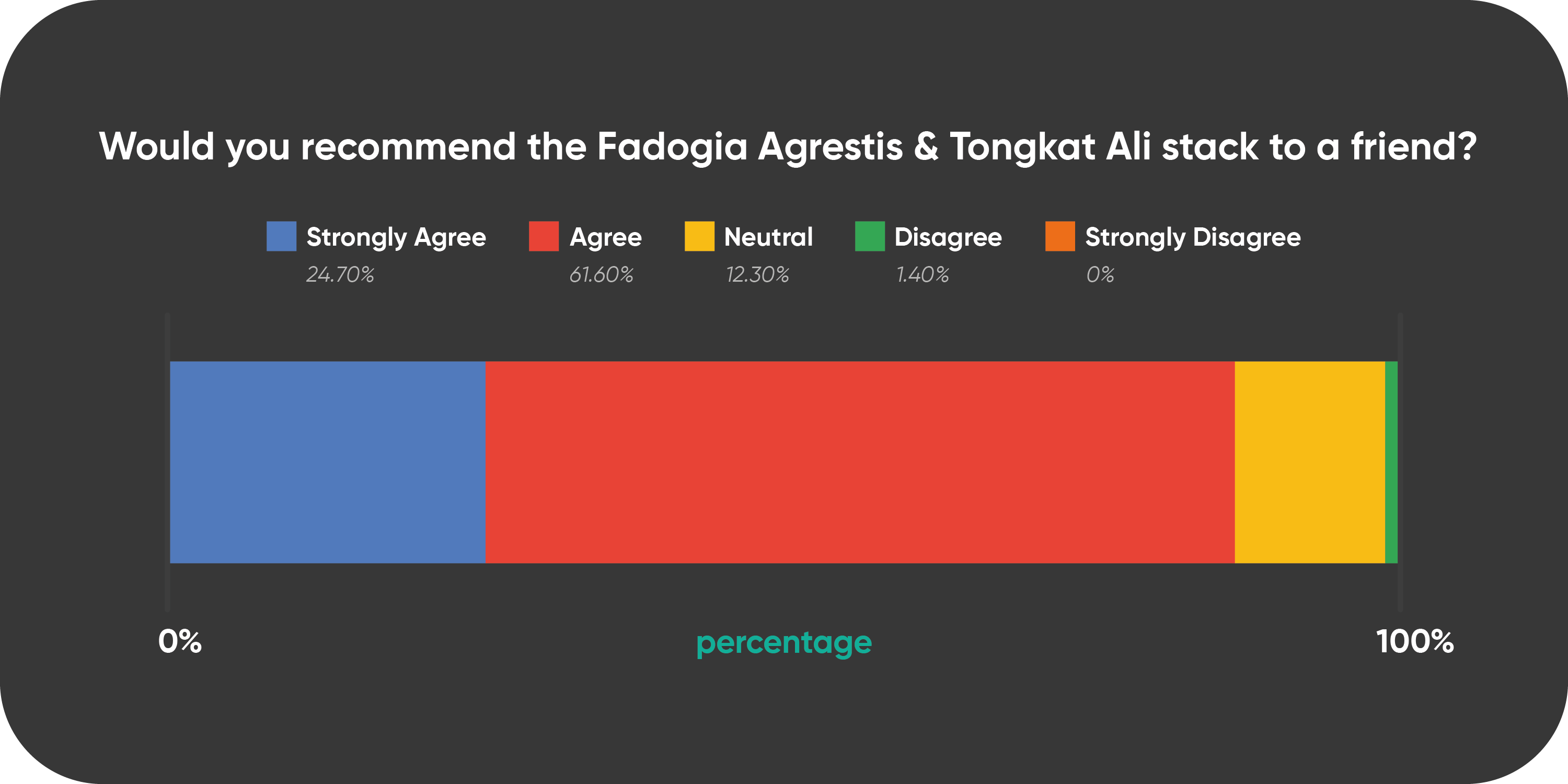 86.3% of users agreed or strongly agreed that they would recommend the Fadogia Agrestis and Tongkat Ali stack to a friend.